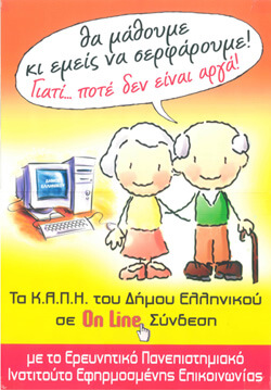 13-03-2010 13:38"Θα μάθουμε κι εμείς να σερφάρουμε, γιατί ποτέ δεν είναι αργά", αναφέρουν τα ΚΑΠΗ του Δήμου Ελληνικού στην αφίσα που έφτιαξαν αποκλειστικά για τη μέρα της 10άτης Μαρτίου που επισκέφτηκαν τον Πολυχώρο "Απόλλων" του Πειραιά, και σε συνεργασία με το Ερευνητικό Πανεπιστημιακό Ινστιτούτο Εφηρμοσμένης Επικοινωνίας γνώρισαν καλύτερα τους υπολογιστές και το Διαδίκτυο με εκπαιδευτές μαθητές της Α' Γυμνασίου.
